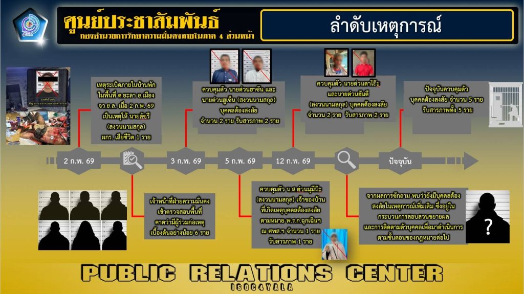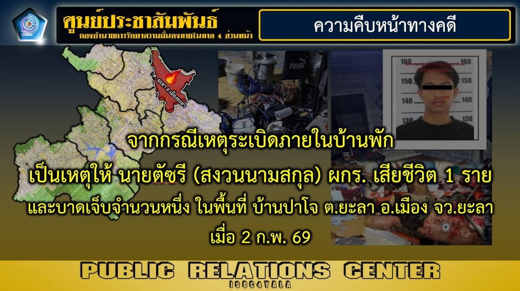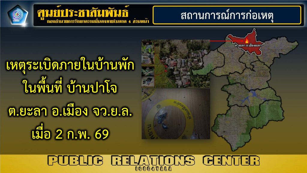 วันนี้ (5 มีนาคม 2569) พันเอก ยุทธนาม เพชรม่วง โฆษกกองอำนวยการรักษาความมั่นคงภายในภาค 4 ส่วนหน้า เปิดเผยว่า จากสถานการณ์เหตุระเบิดภายในบ้านพัก ในพื้นที่ บ้านปาโจ ตำบลยะลา อำเภอเมือง จังหวัดยะลา เมื่อวันที่ 2 กุมภาพันธ์ 2569 นั้น