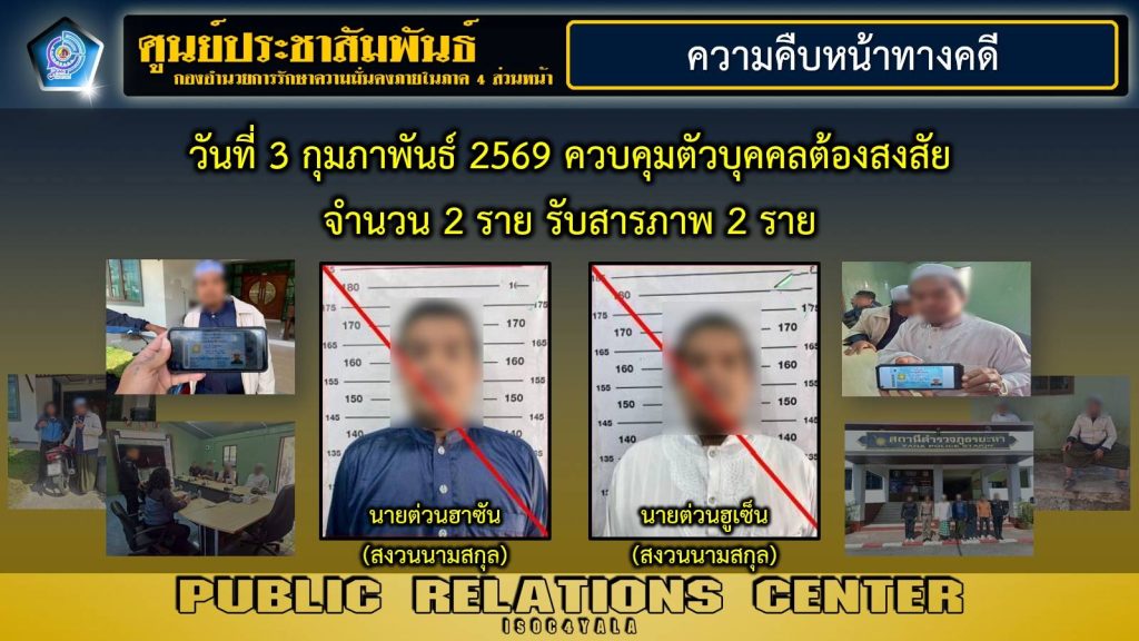 วันที่ 3 กุมภาพันธ์ 2569 เจ้าหน้าที่สามารถควบคุมตัวผู้ต้องสงสัยได้ 2 ราย คือ นายต่วนฮาซัน และนายต่วนฮูเซ็น (สงวนนามสกุล) โดยผู้ต้องสงสัยทั้ง 2 รายให้การรับสารภาพ