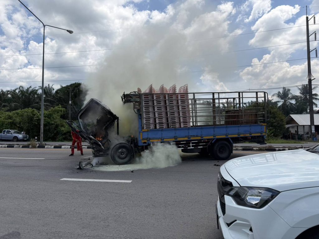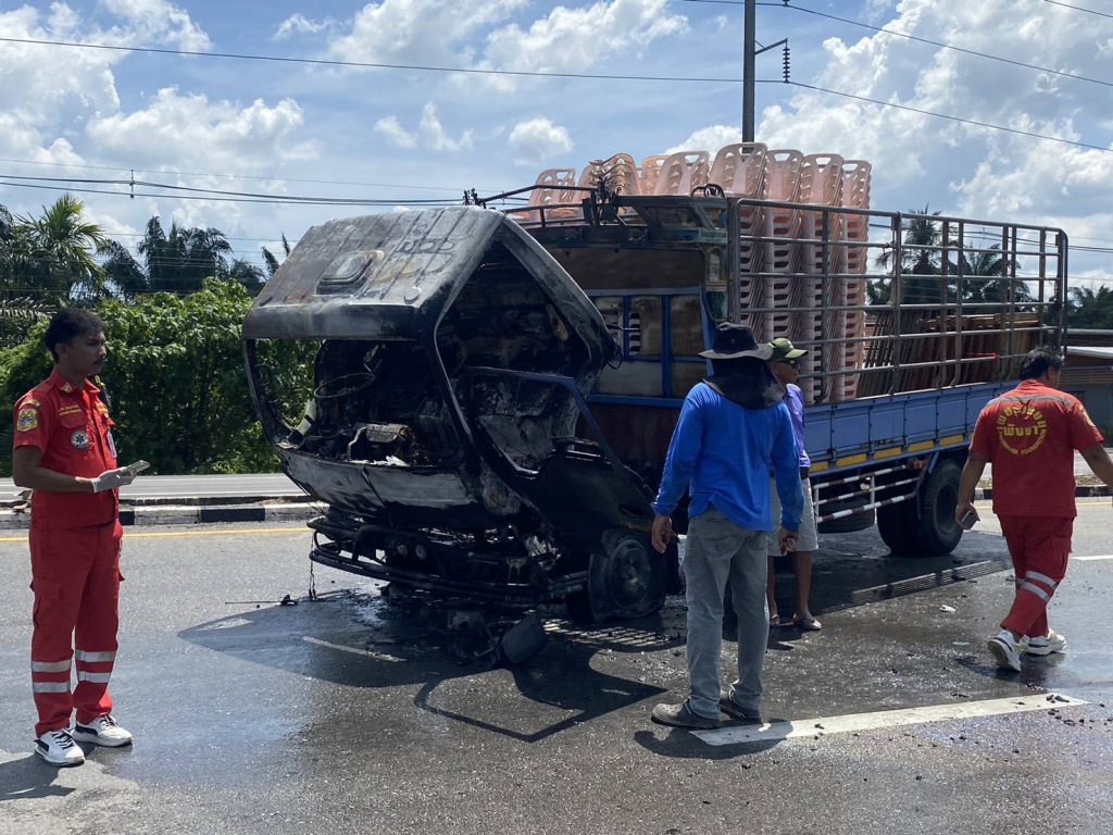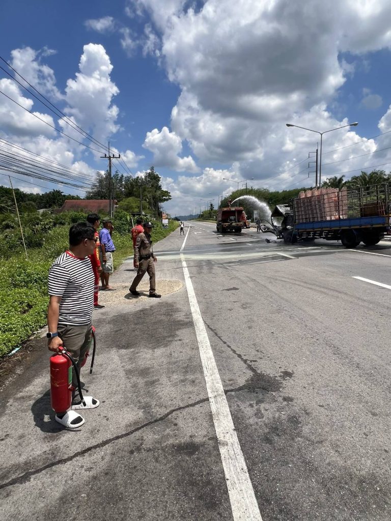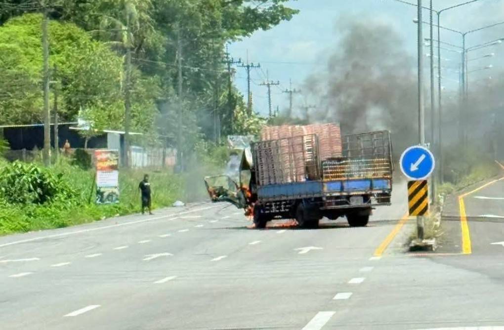 พังงา-ระทึก ไฟไหม้รถบรรทุก 6 ล้อกลางถนนเพชรเกษม อำเภอทับปุด คาดเครื่องยนต์ขัดข้องเกิดประกายไฟ