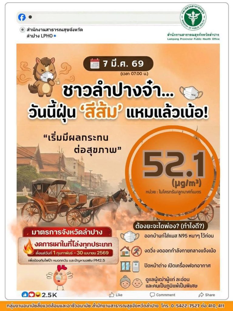 ทางด้าน สสจ.ลำปาง รายงานสถานการณ์ค่าฝุ่นละอองขนาดเล็ก PM2.5 (ประจำวันที่ 7 มี.ค. 2569) วัดได้ 52.1 ไมโครกรัม/ลูกบาศก์เมตรเริ่มมีผลกระทบต่อสุขภาพ ขอให้ประชาชนดูแลสุขภาพ ลดระยะเวลาการทำกิจกรรมกลางแจ้งและสวมหน้ากากอนามัยทุกครั้ง เมื่อออกนอกอาคาร.