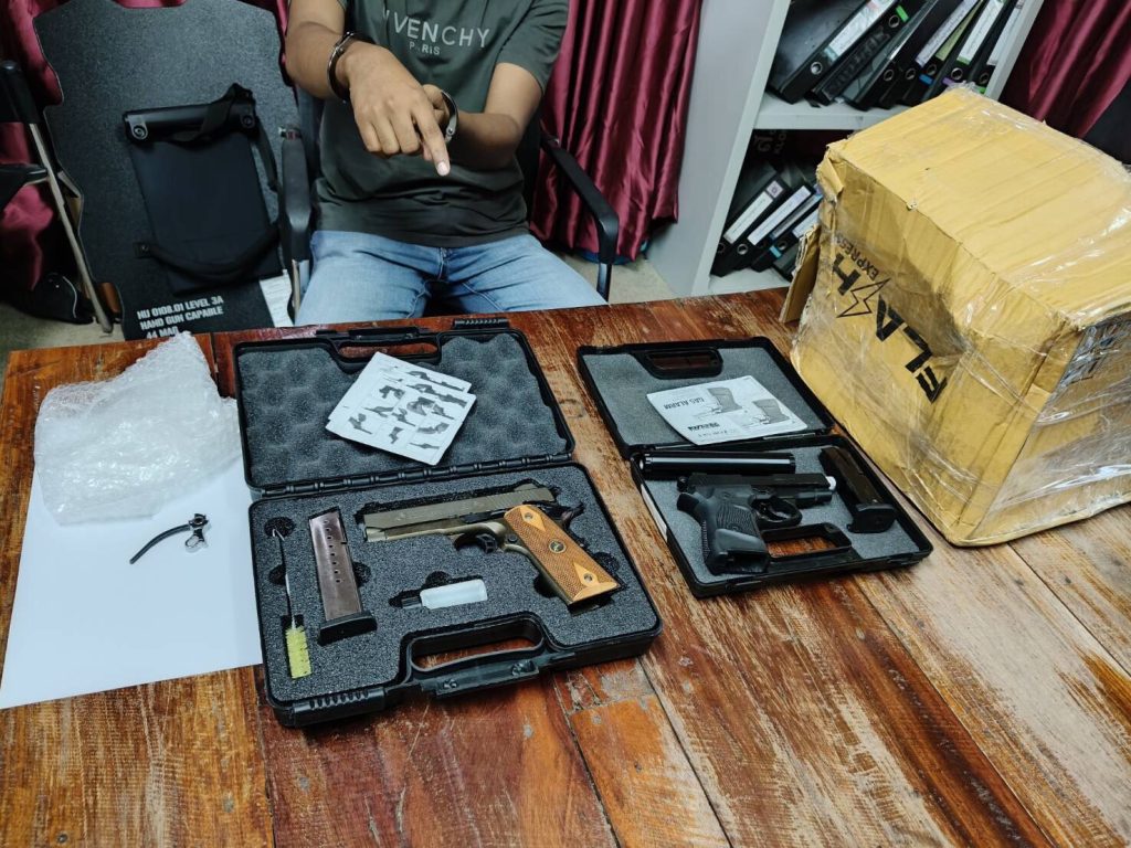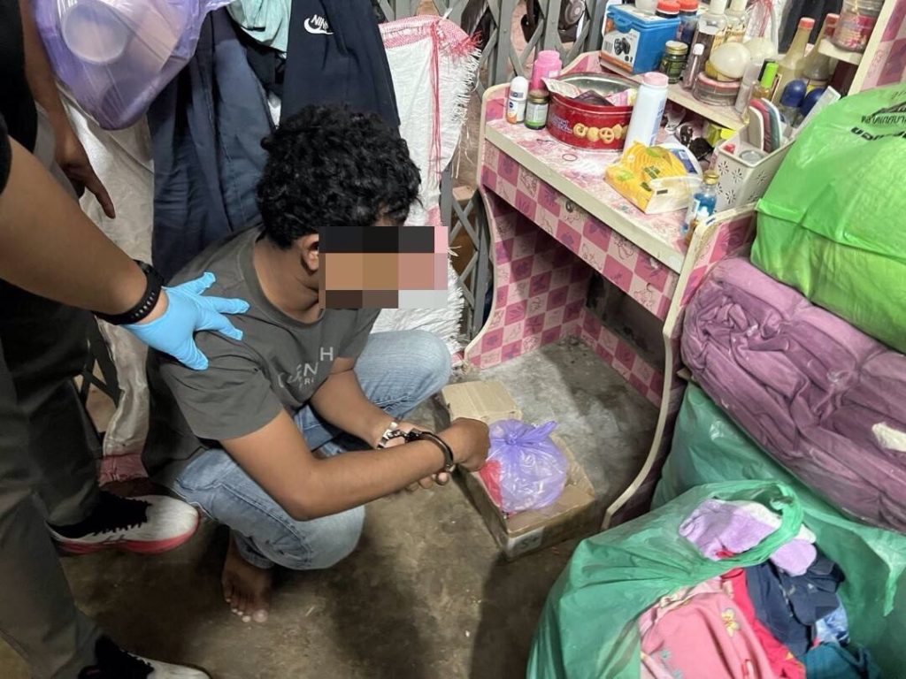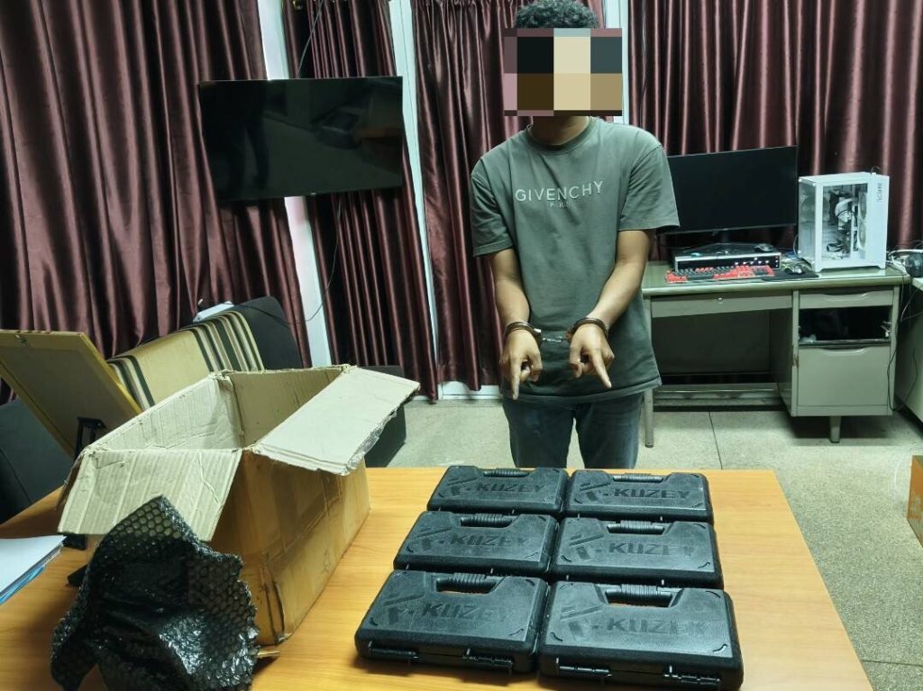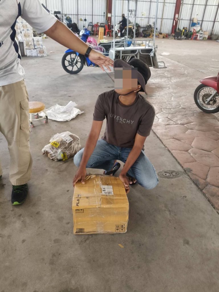 ผู้ต้องหาทราบชื่อภายหลังคือ Mr. SOK EM อายุ 23 ปี สัญชาติกัมพูชา จากการตรวจสอบภายในพัสดุ พบอาวุธปืนไทยประดิษฐ์ (แบลงค์กันดัดแปลง) ขนาด 9 มม. จำนวน 2 กระบอก พร้อมแมกกาซีนรวม 3 ซอง ท่อเก็บเสียง 1 อัน กล่องบรรจุอาวุธปืน 2 กล่อง และโทรศัพท์มือถือ 1 เครื่อง ซึ่งล้วนเป็นสิ่งของผิดกฎหมาย เจ้าหน้าที่จึงแจ้งข้อกล่าวหา ได้แก่ มีอาวุธปืนไว้ในครอบครองโดยไม่ได้รับอนุญาต และเป็นบุคคลต่างด้าวหลบหนีเข้าเมืองโดยผิดกฎหมาย ก่อนควบคุมตัวดำเนินคดีตามขั้นตอน