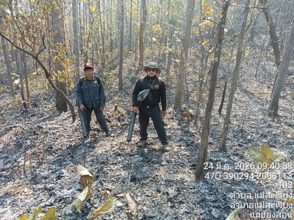 เมื่อวันที่ 24 มีนาคม 2569 สำนักจัดการทรัพยากรป่าไม้ที่ ๑ สาขาแม่ฮ่องสอน เจ้าหน้าที่หน่วยป้องกันรักษาป่าที่ มส.๕ (แม่สะเรียง) ได้รับแจ้งจุดความร้อนจากระบบดาวเทียม Suomi npp ระบบ viirs ประจำวันที่ ๒๔ มีนาคม ๒๕๖๙ ช่วงเช้า จำนวน ๖ จุด จึงเข้าไปดำเนินการตรวจสอบพื้นที่ตามพิกัดดังกล่าว อยู่ในบริเวณป่าบ้านขุนแม่ต้อบ หมู่ ๑๐ บ้านแม่ต้อบใต้ หมู่ ๕ ตำบลบ้านกาศ บ้านดงสงัด หมู่ ๖ และบ้านไร่ หมู่ ๕ ตำบลแม่สะเรียง อำเภอแม่สะเรียง จังหวัดแม่ฮ่องสอน ละได้สนธิกำลังกับชุดไฟป่า อช.แม่สะเรียง ผลการปฏิบัติงานพบว่า ป่าบ้านดงสงัดและป่าบ้านไร่ไฟได้มอดดับไปหมดแล้ว ส่วนพื้นที่บ้านแม่ต้อบใต้กับบ้านขุนแม่ต้อบตรวจสอบแล้วพบว่า ไม่สามารถเข้าดับไฟป่าได้เนื่องจากเป็นภูเขาสูงชันจึงไม่สามารถเข้าดับไฟได้ พื้นที่ถูกไฟไหม้เสียหายประมาณ ๖๐ ไร่