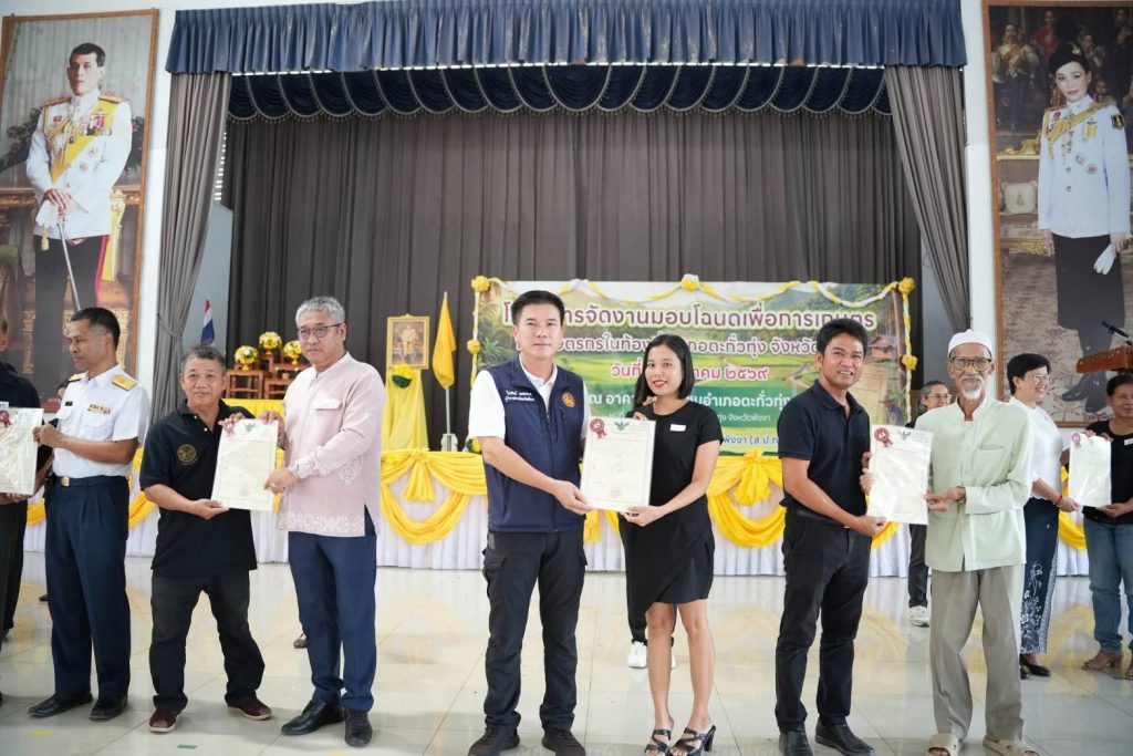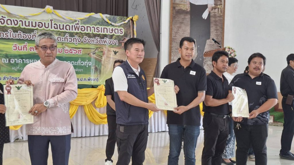 พังงา – ผู้ว่าราชการจังหวัดพังงามอบโฉนดเพื่อการเกษตรแก่เกษตรกรในท้องที่อำเภอตะกั่วทุ่ง จังหวัดพังงาได้มีที่ดินทำกินเป็นของตนเอง สามารถขจัดความยากจน และยกระดับคุณภาพชีวิตเกษตรกร
