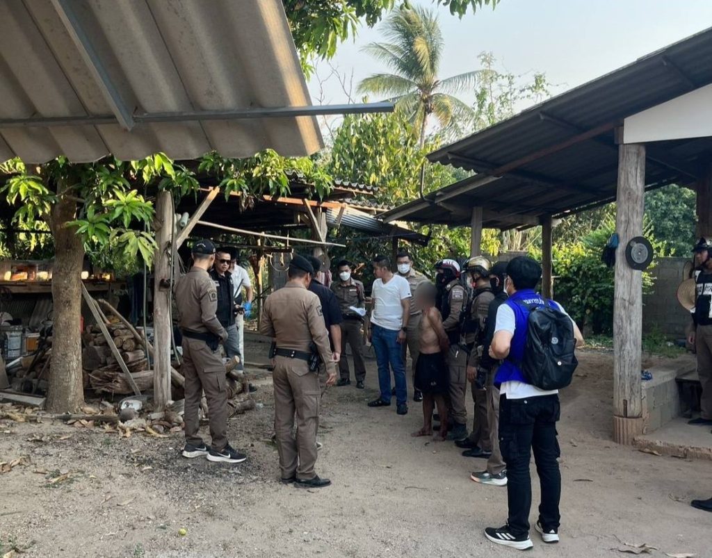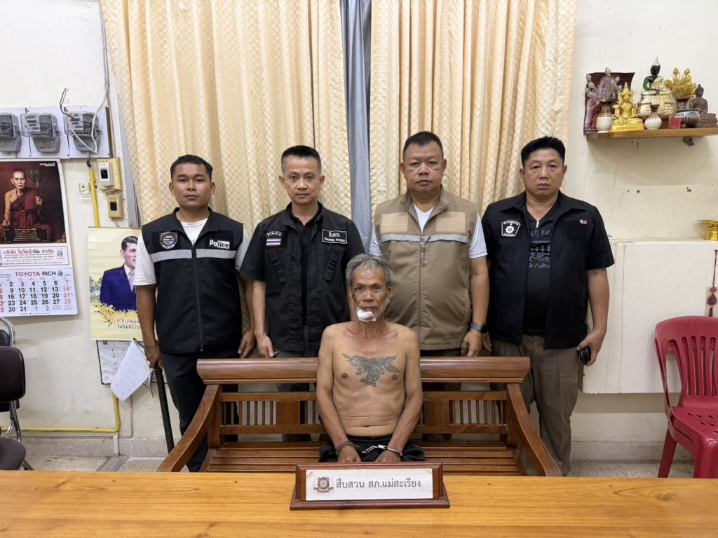 เมื่อไปถึงจนท.พบ นายอุทิศ แสงทอง อายุ 55 ปี ที่อยู่ 232 ม.4 ต.แม่สะเรียง อ.แม่สะเรียง จ.แม่ฮ่องสอน อยู่บริเวณป่าละเมาะกลางทุ่งนาหลังโรงแรมคือเวียง ม.4 ต.แม่สะเรียงฯ ห่างที่เกิดเหตุประมาณ 800 เมตร จึงได้แสดงตัวเป็นเจ้าหน้าที่และได้พูดคุยให้นายอุทิศฯยอมมอบตัวโดยอาศัยอำนาจตามป.วิ อาญา มาตรา 78(1) แต่นายอุทิศฯพยายามจะหลบหนีเจ้าหน้าที่จึงใช้ยุทธวิธีเข้าควบคุมตัวได้ จากการสอบถามนายอุทิศฯให้การวกวนไปมาและได้กลิ่นสุรา จึงนำนายอุทิศฯมายังที่เกิดเหตุเพื่อชี้จุดที่เกิดเหตุและของกลางแต่นายอุทิศฯพูดจาไม่ค่อยรู้เรื่องเหมือนเดิม จนท.จึงได้ทำการตรวจยึดของกลาง มีขวานจำนวน 2 อัน อันที่ 1 ยาวประมาณ 60 เซนติเมตร ซึ่งมีรอยเปื้อนคราบเลือดใกล้ร่างผู้เสียชีวิต และขวาน อันที่2 ยาวประมาณ 30 เซนติเมตร ซึ่งมีรอยเปื้อนเลือด และ มีเสื้อยืดสีดำ จำนวน 1 ตัว กางเกงกีฬาขาสั้นสีดำ จำนวน 1 ตัว ที่นายอุทิศฯสวมใส่อยู่ขณะนั้นฯ จนท.จึงได้ควบคุมตัวพร้อมด้วยของกลางและสิ่งของนำตัวมาที่ สภ.แม่สะเรียง และได้ทำการตรวจปัสสาวะของนายอุทิศฯ โดยใช้ชุดทดสอบสารเมทแอมเฟตามีนฯในปัสสาวะผลปรากฏว่า ผลเป็นลบ(ไม่พบเมทแอมเฟตามีนฯในปัสสาวะ)