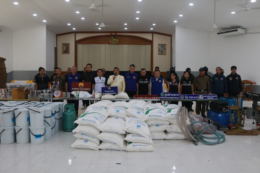 เมื่อวันที่ 21 เม.ย. 69 ที่ หอประชุมอำเภอเมืองหนองคาย นายศรัณย์ศักด์ ศรีเครือเนตร ผวจ.หนองคาย , นายไพฑูรย์ มหาชื่นใจ รอง ผวจ.หนองคาย , นายสุชาติ ทอนมณี ปจ.หนองคาย , นายจักรพงศ์ พันธุ์เพ็ง นอภ.เมืองหนองคาย , น.พ.สุรพงษ์ ผดุงเวียง สสจ.จังหวัดหนองคาย , พ.ต.อ. ประภาพ ธิติศักดิ์ รอง ผบก.ภ.จว.หนองคาย , นายเดชมนตรี ผิวเหลือง ป้องกันจังหวัดหนองคาย , พ.อ. วีรเทพ การุณรอบดุล รอง ผอ.รมน.จังหวัดหนองคาย , นางปิยะมาศ ปรีชาฎก หัวหน้ากลุ่มงานคุ้มครองผู้บริโภคและเภสัชสาธารณสุข ,นายชัยสิทธิ์ คำภาจันทร์ หัวหน้าศูนย์อำนวยการป้องกันและปราบปรามยาเสพติดจังหวัดหนองคาย พร้อมด้วยเจ้าหน้าที่หน่วยงานที่เกี่ยวข้อง ได้ร่วมกันแถลงข่าวการบุกทลายโรงงานผลิตยาแก้ไอเถื่อน เลขที่182 ม.14 ต.วัดธาตุ อ.เมือง จ.หนองคาย ห้องเช่าหมายเลข 4,5 และ 6 ริมถนนบ้านเนินพระเนาว์-นาคลอง ตรวจยึดยาแก้ไอปลอมยี่ห้อดาทิสซิน ชนิดน้ำเชื่อม (DATISSIN) จำนวนมาก น้ำยาผสมเสร็จรอบรรจุ 75 ถัง เครื่องจักร และของกลางอื่น รวม 22 รายการ พบพนักงาน 4 ราย กำลังบรรจุน้ำยาใส่ขวด จึงได้ควบคุมตัว มาทำการสอบสวน