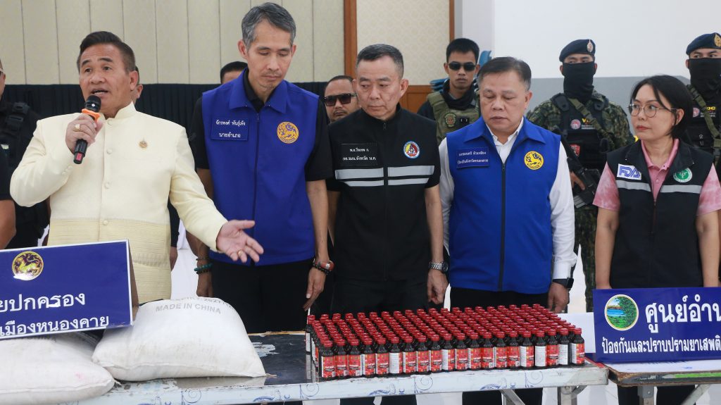 เนื่องจากเมื่อวันที่ 20เม.ย.69 เวลาประมาณ17.30น.นายจักรพงศ์พันธุ์เพ็ง นายอำเภอเมืองหนองคาย , นายสมปอง เที่ยงมนต์ ปลัดอำเภอหัวหน้ากลุ่มงานบริหารงานปกครอง อำเภอเมืองหนองคาย , นายวันชัย สารภาค หัวหน้ากลุ่มงานความมั่นคง อำเภอเมืองหนองคาย , นายอภิวัฒน์ อินทร์หา ปลัดป้องกันอำเภอเมืองหนองคาย , พ.ต.ท.ผดุงเกียรติ สายคำภา หน.ชุด สืบสวน ภ.จว.นค., นางปิยะมาศ ปรีชาฎก หัวหน้ากลุ่มงานคุ้มครองผู้บริโภคสำนักงานสาธารณสุขจังหวัดหนองคาย และสมาชิก อส. ร้อย.อส.อ.นค. 2 จำนวนหนึ่ง ได้เข้าตรวจสอบห้องเช่าที่ร้องเรียนจากประชาชนว่ามีกลุ่มบุคคลน่าสงสัยเปิดโรงงาน เลขที่182 ม.14 ต.วัดธาตุ อ.เมือง จ.หนองคาย ห้องเช่าหมายเลข 4,5 และ 6 ริมถนนบ้านเนินพระเนาว์-นาคลองที่ มีการทำงานทั้งวันมีเสียงดัง ของเครื่องจักรตลอดคืน แถมได้กลิ่นสารเคมี จึงเข้าตรวจสอบพบเครื่องจักรกำลังผลิตยาแก้ไอปลอม มีพนักงาน 4 ราย กำลังช่วยกันบรรจุน้ำยาใส่ขวด จึงได้ควบคุมตัว และได้ตรวจยาแก้ไอยี่ห้อ (DATISSIN) กว่า 200 ขวด ขวดละ 60 ML ฉลากยา จำนวนหนึ่ง น้ำยาผสมเสร็จ 75 ถัง เครื่องจักร กระสอบวัตถุดิบที่ใช้ในการผลิต 22 รายการ และขยายผลติดตามสามารถตรวจยึดยาแก้ไอได้เพิ่มอีกจำนวนหนึ่ง ในพื้นที่ ต.หนองกอมเกาะ อ.เมืองหนองคาย เบื้องต้นพบมีการประกาศขายตามโซเชียล ส่งขายทั่วประเทศ และ สปป.ลาว ราคาขวดละ 70 บาท เป็นที่นิยมของกลุ่มวัยรุ่นเชื่อว่านำไปผสมเป็น 4×100