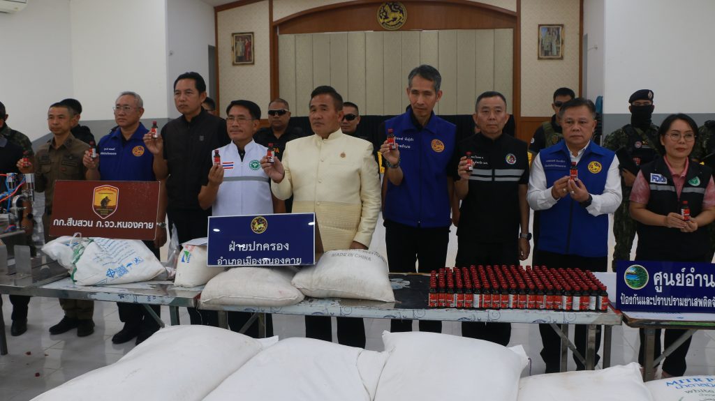 ผู้ว่าฯหนองคาย แถลงข่าวหลังฝ่ายปกครองอำเภอเมืองหนองคาย ร่วมกับ กก.สส.ภ.จว.หนองคาย สสจ.หนองคาย บุกทลายเครือข่ายโรงงานผลิตยาแก้ไอปลอม เปิดทำงานตลอด 24 ชม. หลังได้รับร้องเรียนจากประชาชน ยึดของกลาง 22 รายการ มูลค่ารวมประมาณ 5.5 ล้านบาท