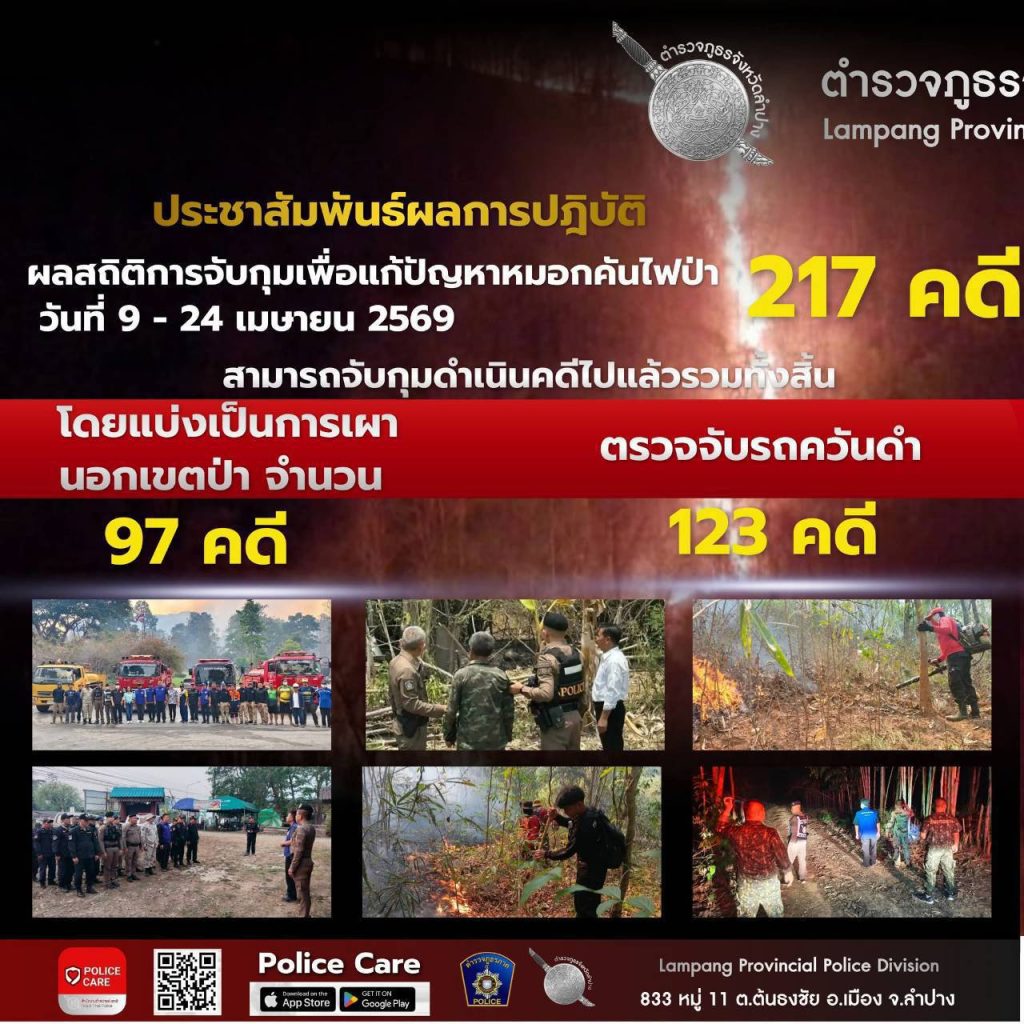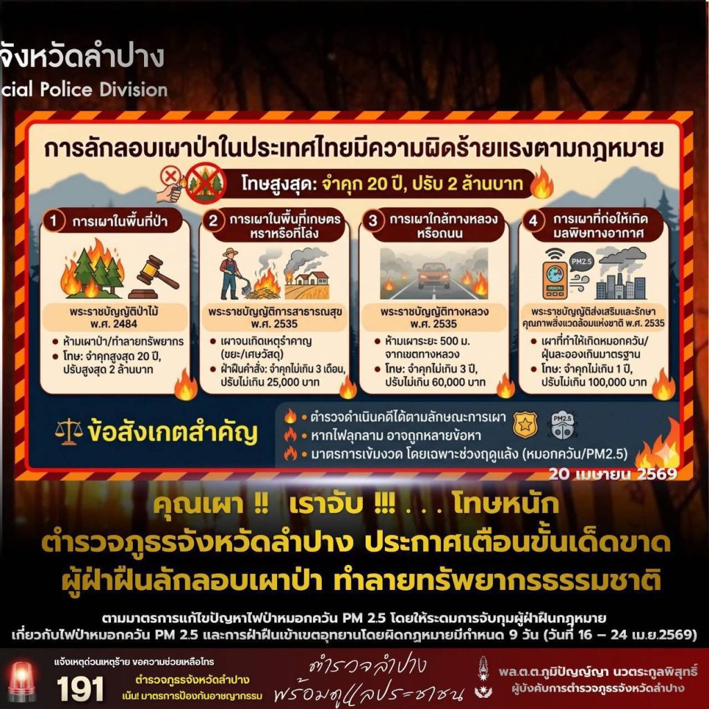 เมื่อวันที่ 22 เม.ย.2569 ที่ จ.ลำปาง ผู้สื่อข่าวรายงานว่า ตำรวจภูธรจังหวัดลำปาง โดย พล.ต.ต.ภูมิปัญญ์ญา นวตระกูลพิสุทธิ์ ผบก.ภ.จว.ลำปาง ประกาศเตือนขั้นเด็ดขาดไปถึงผู้ที่จะฝ่าฝืนลักลอบเผาป่า ทำลายทรัพยากรธรรมชาติ ต้องถูกดำเนินคดีตามกฎหมายอย่างไม่ละเว้น“ คุณเผา เราจับ พร้อมดำเนินคดีตามกฎหมาย ฝ่าฝืนมีโทษหนัก ทั้งจำ ทั้งปรับ”ตามการดำเนินการระดมกวาดล้าง เพื่อแก้ไขปัญหาหมอกควัน ไฟป่า PM 2.5 ห้วงวันที่ 16-24 เม.ย. 2569