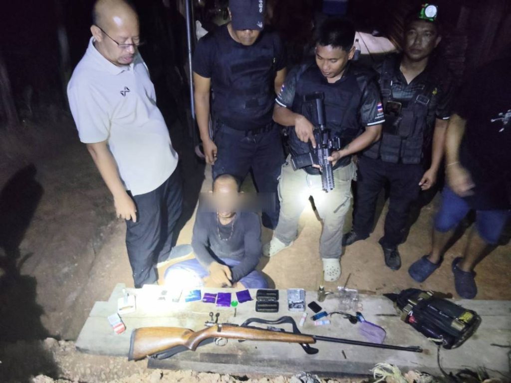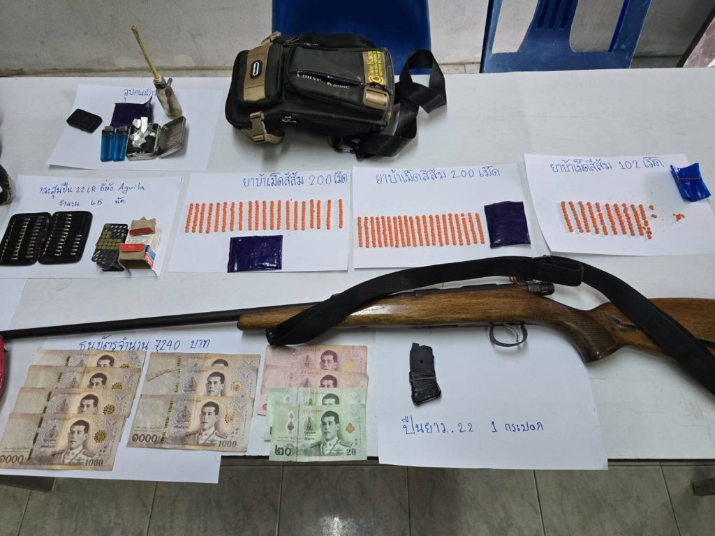 ทราบชื่อคือ นายสุวิทย์ อายุ 51 ปี พร้อมของกลางจำนวนมาก ได้แก่ อาวุธปืนยาวขนาด .22 จำนวน 1 กระบอก เครื่องกระสุนปืนขนาดเดียวกัน 65 นัด ยาเสพติดให้โทษประเภท 1 (ยาบ้า) จำนวน 502 เม็ด เงินสด 7,240 บาท กระเป๋าสะพายสีเขียว 1 ใบ อุปกรณ์เสพยาเสพติดทั้งแบบฟอยล์ใช้แล้ว 20 ชิ้น และชุดอุปกรณ์การเสพอีก 1 ชุด รวมถึงถุงบรรจุแบบกดปิด-ดึงเปิด