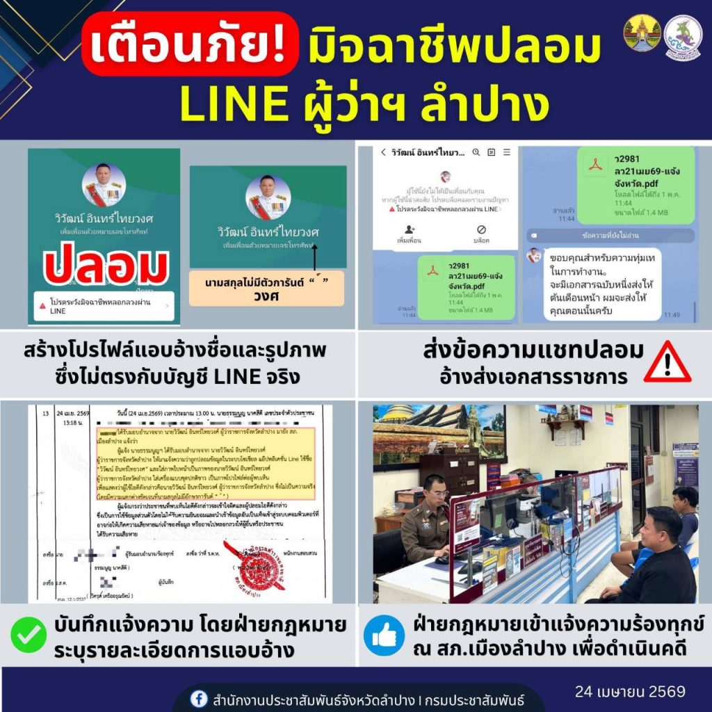เมื่อวันที่ 24 เม.ย.2569 ที่ จ.ลำปาง ผู้สื่อข่าวรายงานว่า ขณะนี้มีมิจฉาชีพแอบอ้างปลอมบัญชี LINE ของนายวิวัฒน์ อินทร์ไทยวงศ์ ผู้ว่าราชการจังหวัดลำปางเพื่อหลอกลวงให้ผู้อื่นหรือประชาชนให้ได้รับความเสียหาย