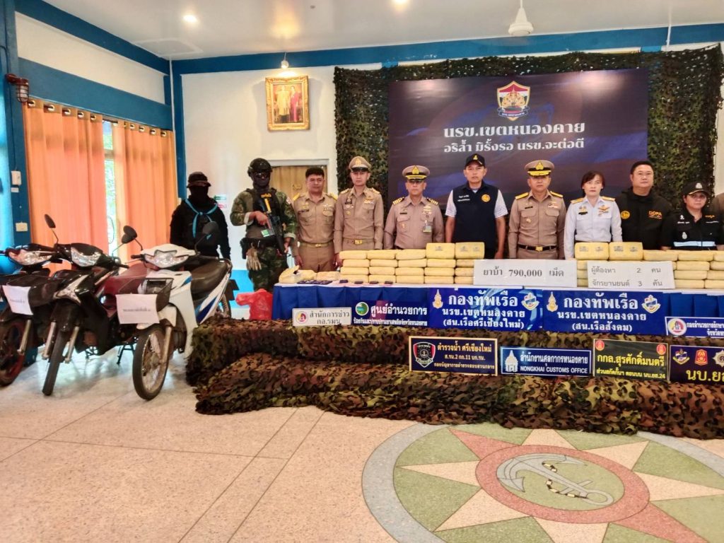 วันที่ 25 เมษายน 2569 ที่ นรข.เขตหนองคาย อ.ศรีเชียง ใหม่ จังหวัดหนองคาย พล.ร.ต.ณรงค์ เอมดี ผู้บัญชาการหน่วยเรือรักษาความสงบเรียบร้อยตามลำแม่น้ำโขง พร้อมด้วย นายไพฑูรย์ มหาชื่นใจ รองผู้ว่าราชการจังหวัดหนองคาย,น.อ.วิศิษฐ์พงศ์ เจริญวิชยเดช ผบ.นรข.เขตหนองคาย ,นาวาโทคมสัน จ้อยลี หัวหน้าสถานีเรือศรีเชียงใหม่, เรือเอกไพรสน พลเสน หัวหน้าสถานีเรือสังคม , นางสาววรรณา ผู้อุตส่าห์ นายด่านศุลกากรหนองคาย ,นายชัยสิทธิ์ คำภาจันทร์ หน.ศูนย์อำนวยการป้องกันและปราบปรามยาเสพติดจังหวัดหนองคาย ,นายจรัญ กลางประดิษฐ์ นายอำเภอศรีเชียงใหม่ ,ตร.สภ.ศรีเชียงใหม่ และหน่วยงานความมั่นคงในพื้นที่ ได้ร่วมกันแถลงผลการจับกุม 2 ผู้ต้องหา เครือข่าย“อาเฉิน” ขบวนการค้ายาเสพติดรายใหญ่ พร้อมยาบ้า 7.9แสนเม็ด