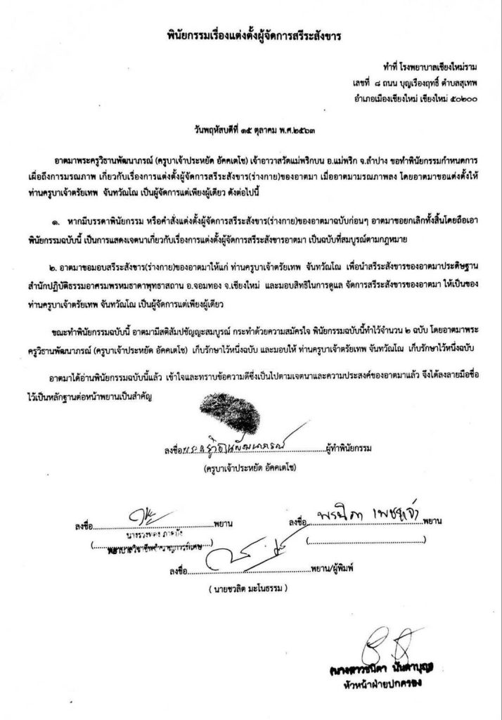 ทั้งนี้ พระและชาวบ้านแม่พริกบน กล่าวว่า เมื่อวัน 24 เม.ย.ที่ผ่านมา ได้รับแจ้งจากผู้นำชุมชนว่า มีพระจาก จ.เชียงใหม่ จะมาเคลื่อนย้ายร่างสรีระ พระครูวิธานพัฒนาภรณ์(ครูบาประหยัด อคฺคเตโช) อดีตเจ้าอาวาสวัดแม่พริกบน ออกจากวัด ต่อมามีรถตู้กู้ภัยจาก จ.เชียงใหม่ มาจอดที่หน้าวัดพร้อมด้วยทนายความนำพินัยกรรมเพื่อรับร่างสรีระครูบาหยัด ไปอาศรมพรหมธาดาพุทธสถาน อ.จอมทอง จ.เชียงใหม่ ชาวบ้านไม่ยินยอมจึงเกิดการชุลมุนกันขึ้น สำหรับหนังสือที่ระบุว่าเป็น “พินัยกรรมเรื่องแต่งตั้งผู้จัดการสรีระสังขาร” ซึ่งทำขึ้นเมื่อวันที่ 15 ต.ค.63 ณ รพ.เชียงใหม่- ราม โดยเนื้อหาระบุ“ขอมอบสรีระสังขารให้แก่ ท่านครูบาเจ้าตรัยเทพ จันทวัณโณ เพื่อนำไปประดิษฐาน ณ อาศรมพรหมธาดาพุทธาสถาน อ.จอมทอง จ.เชียงใหม่ และแต่งตั้งให้เป็นผู้จัดการสรีระแต่เพียงผู้เดียว”พร้อมกับลงลายมือชื่อพยานชัดเจน