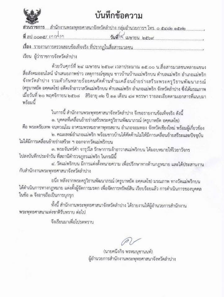 เมื่อวันที่ 26 เม.ย. 2569 ที่ จ.ลำปาง ผู้สื่อข่าวรายงานว่า สนง.พระพุทธศาสนาจังหวัดลำปาง นายคนึงกิจ พรหมนุชานนท์ ผอ.สำนักงานพระพุทธศาสนาจังหวัดลำปาง รายงานการตรวจสอบข้อเท็จจริง ถึง ผวจ. ลำปาง โดยระบุว่า ด้วยเมื่อวันที่ 24 เม.ย.2569 เวลา 15.00 น.สื่อสังคมออนไลน์ นำเสนอภาพข่าวเหตุการณ์ชุลมุนชาวบ้านแม่พริกบน อ.แม่พริก รวมตัวกันคัดค้านห้ามเคลื่อนย้ายร่างสรีระพระครูวิธานพัฒนาภรณ์ (ครูบาหยัด อคฺคเตโช) อดีตเจ้าอาวาสวัดแม่พริกบน ซึ่งได้มรณภาพเมื่อวันที่ 20 พ.ย.2568 สิริอายุ 72 ปี 11 เดือน 47 พรรษา