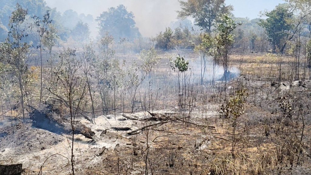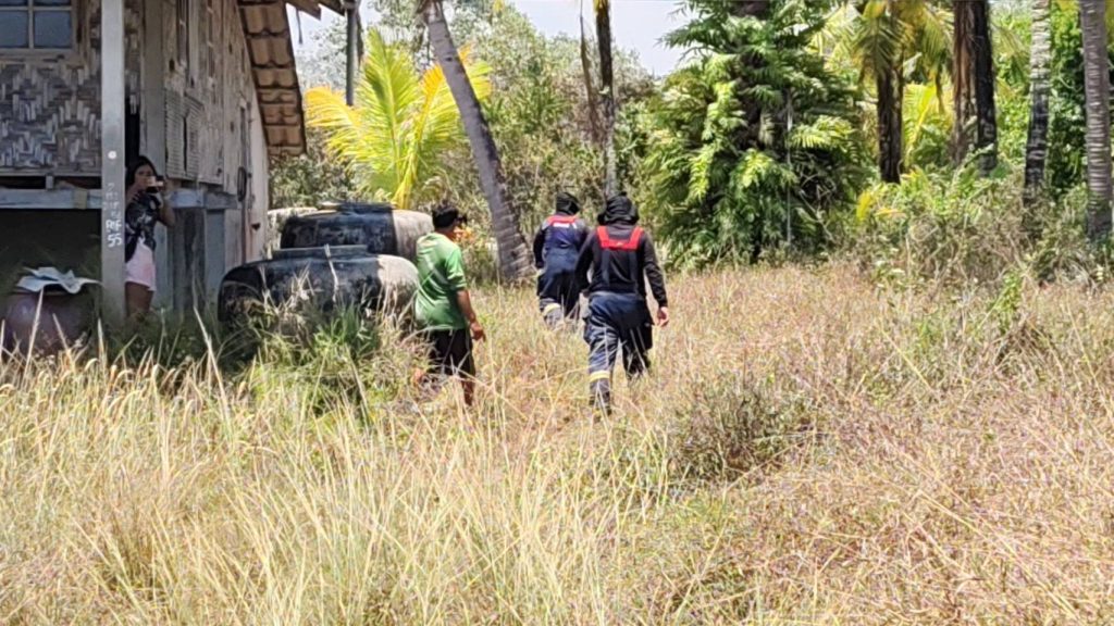 พังงา ภาพมุมสูง เจ้าหน้าที่ดับเพลิงเข้าฉีดน้ำสกัดเพลิงที่กำลังลุกไหม้ที่ดินรกร้างของเอกชนนับ 100 ไร่ไม่ให้ลุกลามถึงบ้านเรือนประชาชนและโรงแรมบริเวณใกล้เคียง